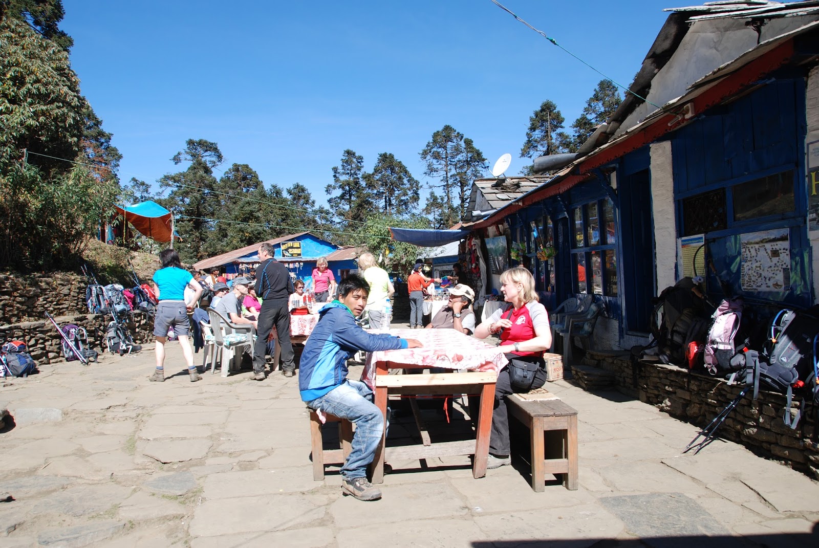 Aujourd'hui, pour voir les reflets du soleil levant à Poon Hill, nous devons nous lever à 4 h 30. Nous nous préparons rapidement et sans avoir avalé le moindre nutriment, nous partons avec notre sac à dos allégé et notre lampe frontale. La marche dans le noir est impressionnante mais pas très compliqué et avec tous les trekkeurs qui se sont mis en route au même moment, nous représentons une très longue chenille lumineuse. Nous devons franchir des tourniquets grinçants et il y a aussi un péage !