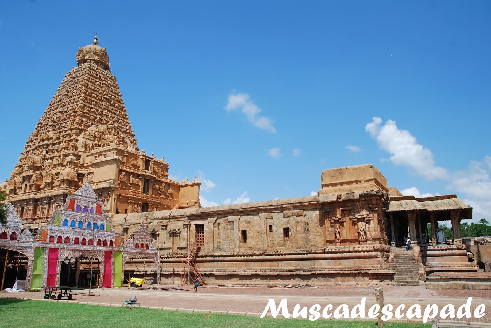 La première visite du jour aura pour but Tanjore et la visite du temple de Brihadesvara "le grandiose de l'Inde". C'est l’un des chefs-d’œuvre des architectes Chola. La construction de ce temple fut initiée par le roi Chola Rajaraja 1er (985-1012) peut-être dans sa 19e année de règne (1003-1004) et consacrée par ses propres mains lors de sa 25e année de règne (1009-1010). Un prakara (enceinte extérieure) à colonnes massives avec des sanctuaires dédiés aux ashta dikpalas (gardiens des huit directions) et une entrée principale avec un gopuram (construction par laquelle on pénètre dans les enceintes successives d'un temple) entourent le temple massif. Le sanctuaire lui-même occupe le centre de la moitié arrière de la cour rectangulaire. Le vimana (nom donné à la construction, souvent en forme de pyramide, qui recouvre le saint des saints des temples de l'Inde du sud dans l'architecture dravidienne) s'élève à une hauteur de 59,82 mètres du sol. Il a fallu 6 km de rampe pour amener les matériaux de construction. Cette grande pyramide est ornée de décors moulés; le rez-de-chaussée (prastara) comprend deux niveaux où figurent des représentations de Shiva. Ce vimana compte treize étages (talas), et est coiffé d'un sikhara octogonal. Il existe un passage circumambulatiore autour du sanctuaire abritant un lingam massif (objet dressé, souvent d'apparence phallique, représentation classique, dite anicônique, de Shiva et de l'énergie masculine). Les murs du temple sont ornés de peintures murales expressives et délicates. Quatre-vingt-une des cent huit poses (karanas) du Baharatanatyam sont gravées sur les murs de la partie inférieure (bhumi) autour du sanctuaire (garbhagriha). Il y a aussi un sanctuaire dédié à Amman qui date du XIIIe siècle. Hors de l'enceinte du temple se trouvent les murs du petit fort de Sivaganga entourés d'un fossé, et le réservoir de Sivaganga, construits au XVIe siècle par les Nayaks de Tanjore qui succédèrent aux empereurs Chola. Les murs du fort entourent et protègent le complexe du temple et font partie de la zone protégée par l’Archaeological Survey of Indian.